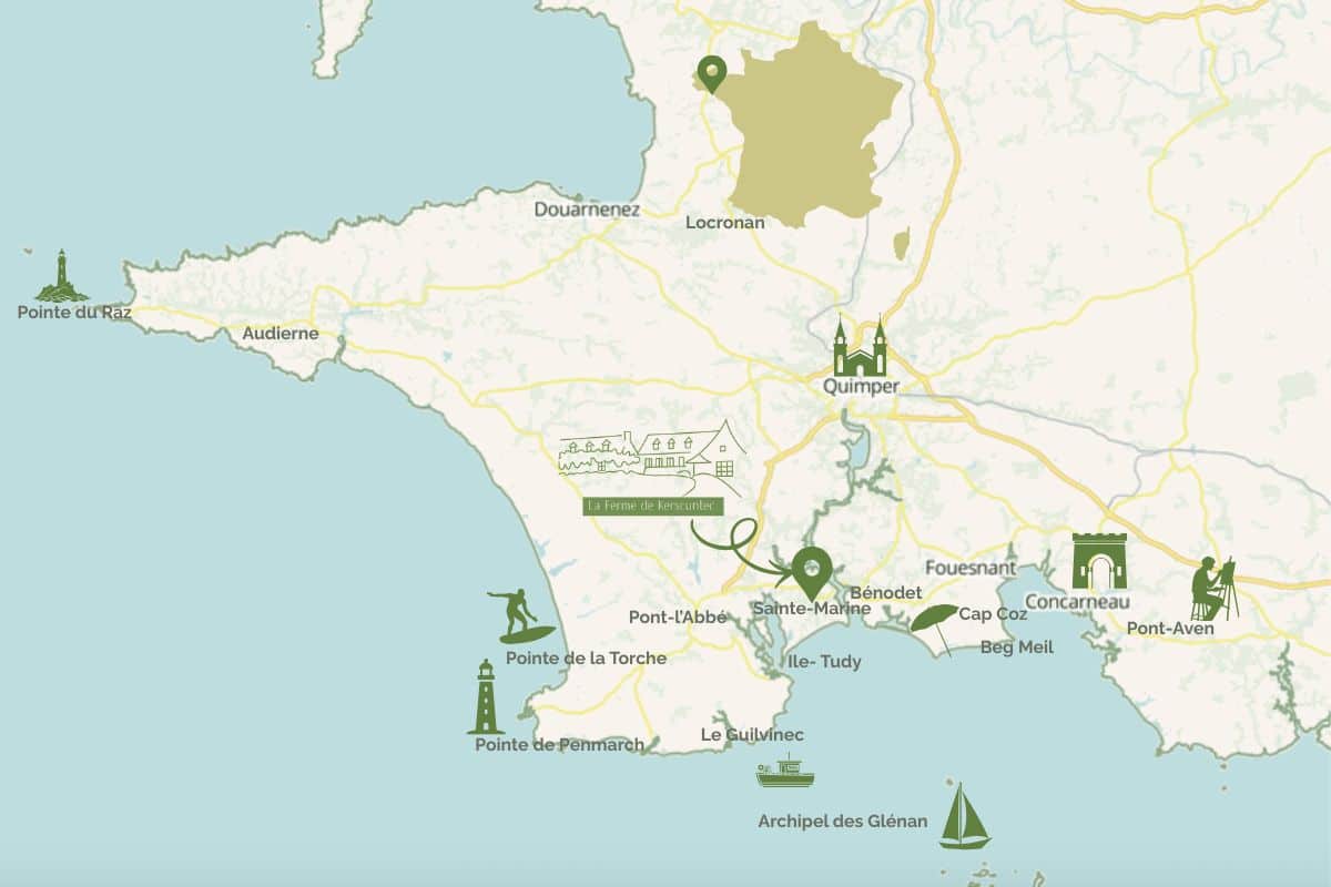Idéalement située à 5 minutes de Bénodet et 20 minutes de Quimper, la Ferme de Kerscuntec est le point de départ parfait pour explorer les trésors du Finistère Sud.