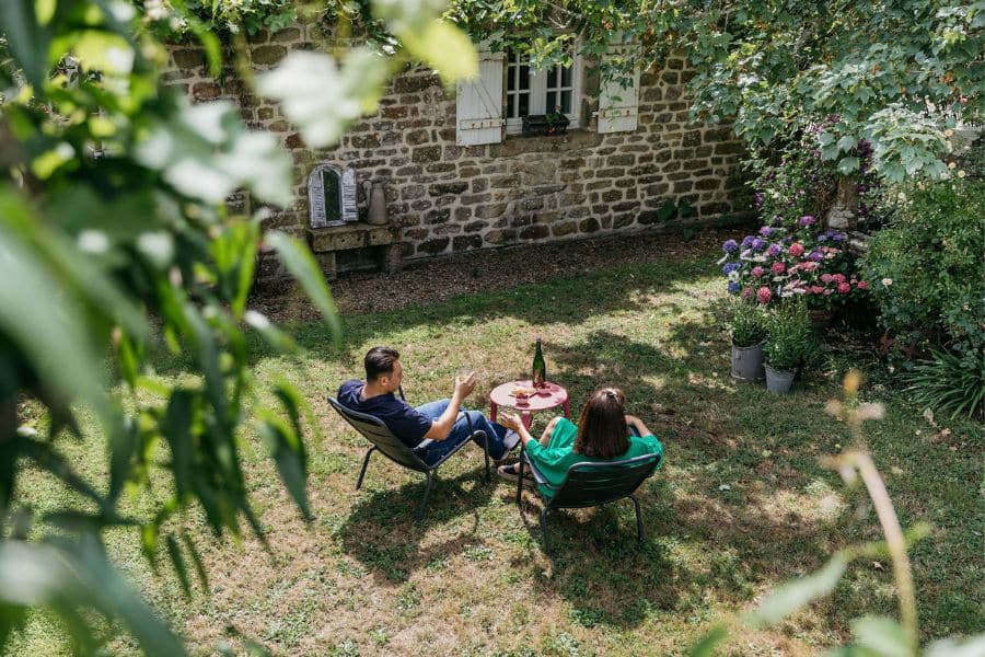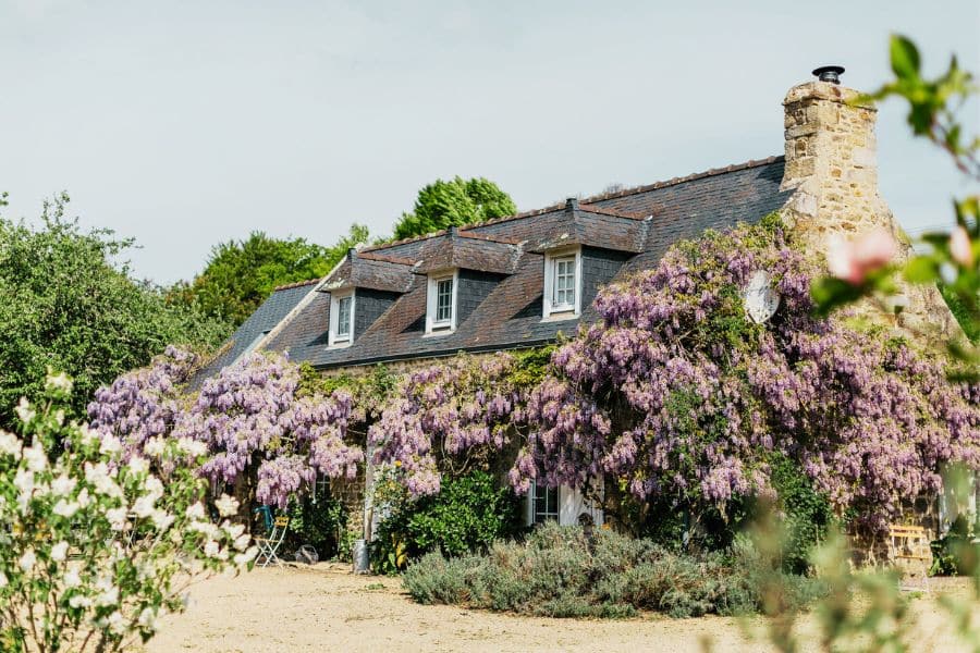 La maison est bordée d’hortensias, fleur bretonne par excellence, aux teintes bleues, mauves et roses, qui apportent de jolies touches de couleur au jardin. Nichée au cœur d’un site naturel protégé, la Ferme de Kerscuntec invite au calme et à la détente, à deux pas d’une belle plage de sable blanc. Transats et salons de jardin sont disposés çà et là pour profiter de pauses farniente entre balades en pleine nature ou au bord de l’eau. Entouré d’un verger aux arbres fruitiers variés, le jardin vit au rythme des saisons, simple et convivial.