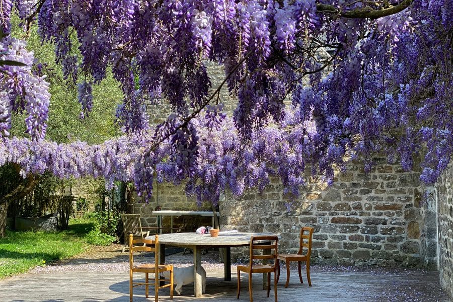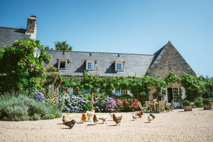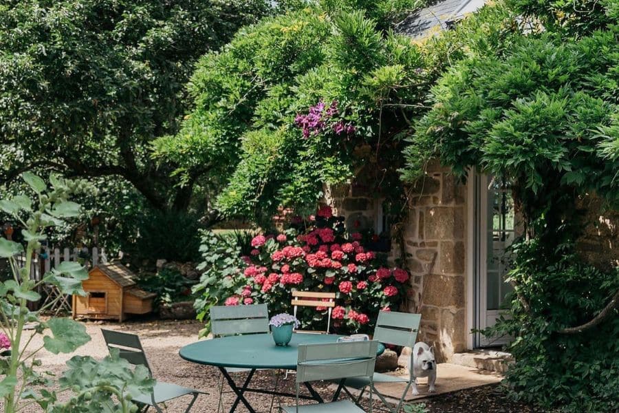 La maison est bordée d’hortensias, fleur bretonne par excellence, aux teintes bleues, mauves et roses, qui apportent de jolies touches de couleur au jardin. Nichée au cœur d’un site naturel protégé, la Ferme de Kerscuntec invite au calme et à la détente, à deux pas d’une belle plage de sable blanc. Transats et salons de jardin sont disposés çà et là pour profiter de pauses farniente entre balades en pleine nature ou au bord de l’eau. Entouré d’un verger aux arbres fruitiers variés, le jardin vit au rythme des saisons, simple et convivial.